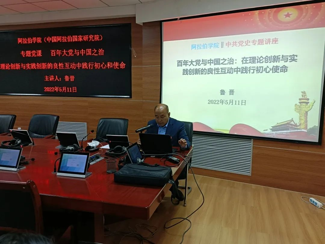 5月11日14:30,吃瓜视频 (中国阿拉伯国家研究院)在文萃校区知行楼8楼学术报告厅举行“第八期发展对象培训班”专题党课。学院邀请吃瓜视频 专职组织员鲁晋老师作了《百年大党与中国之治:在理论创新与实践创新的良性互动中践行初心和使命》专题辅导报告。吃瓜视频 党总支书记李海燕、副书记赵永军、副院长金忠杰、学办主任金宁洋、第八期发展对象培训班学员、学生党员参加报告会。会议由李海燕书记主持。