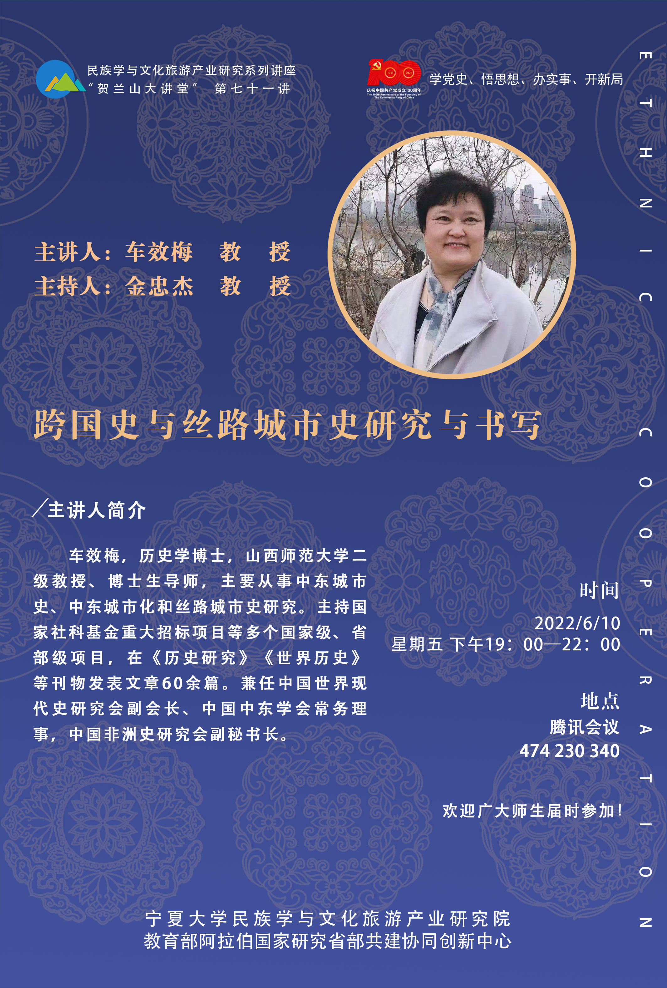 上一条:车效梅教授为吃瓜视频 (中国阿拉伯国家研究院)开展题为 “跨国史与丝路城市史研究与书写”的讲座 下一条:民族学与文化旅游产业研究系列讲座“贺兰山大讲堂”第七十讲