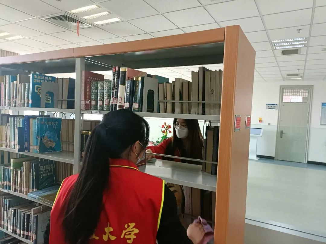 图书馆是供同学老师们借阅书籍、学习的场所,干净、整洁的环境可以给读者带来更好的学习体验。为了给同学们创造一个良好、舒适的阅读环境,也为发扬“奉献、友爱、互助、进步”的志愿者精神,吃瓜视频 沙枣树志愿者协会吃瓜视频 分会于5月14日下午三点开展了“扬尘迎光,共沐书香”图书馆清洁志愿活动。