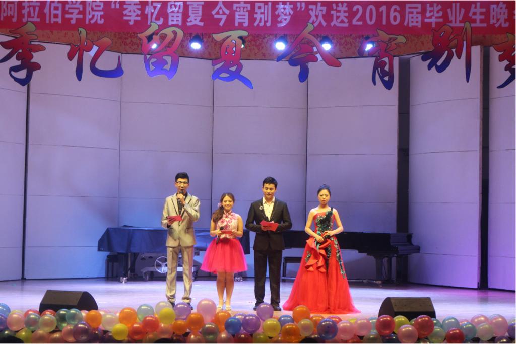 晚会在开场舞《奇遇记》绚丽多彩的舞姿中宣告开始。首先,由张前进书记上台再致辞。他对阿院全体师生过去对阿院做出的贡献进行了总结,对毕业生进行了真诚的教诲和由衷的祝福,表现了其对阿院的光明未来的展望和对毕业生亲切的关怀和殷切的期盼。