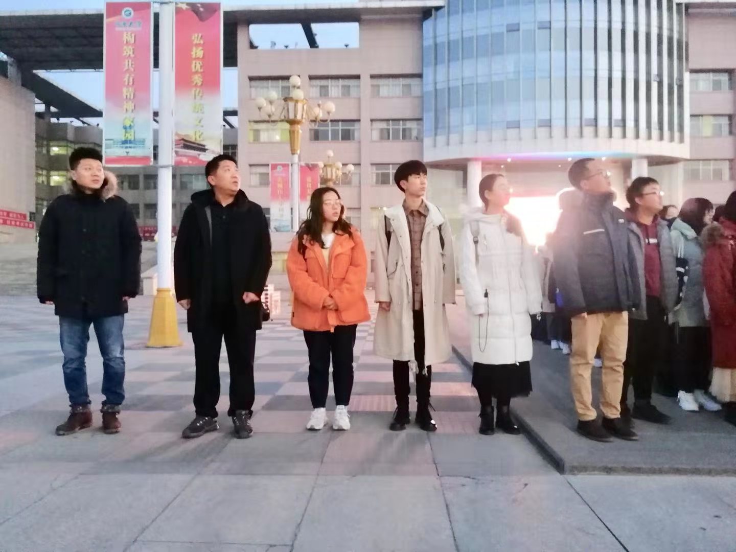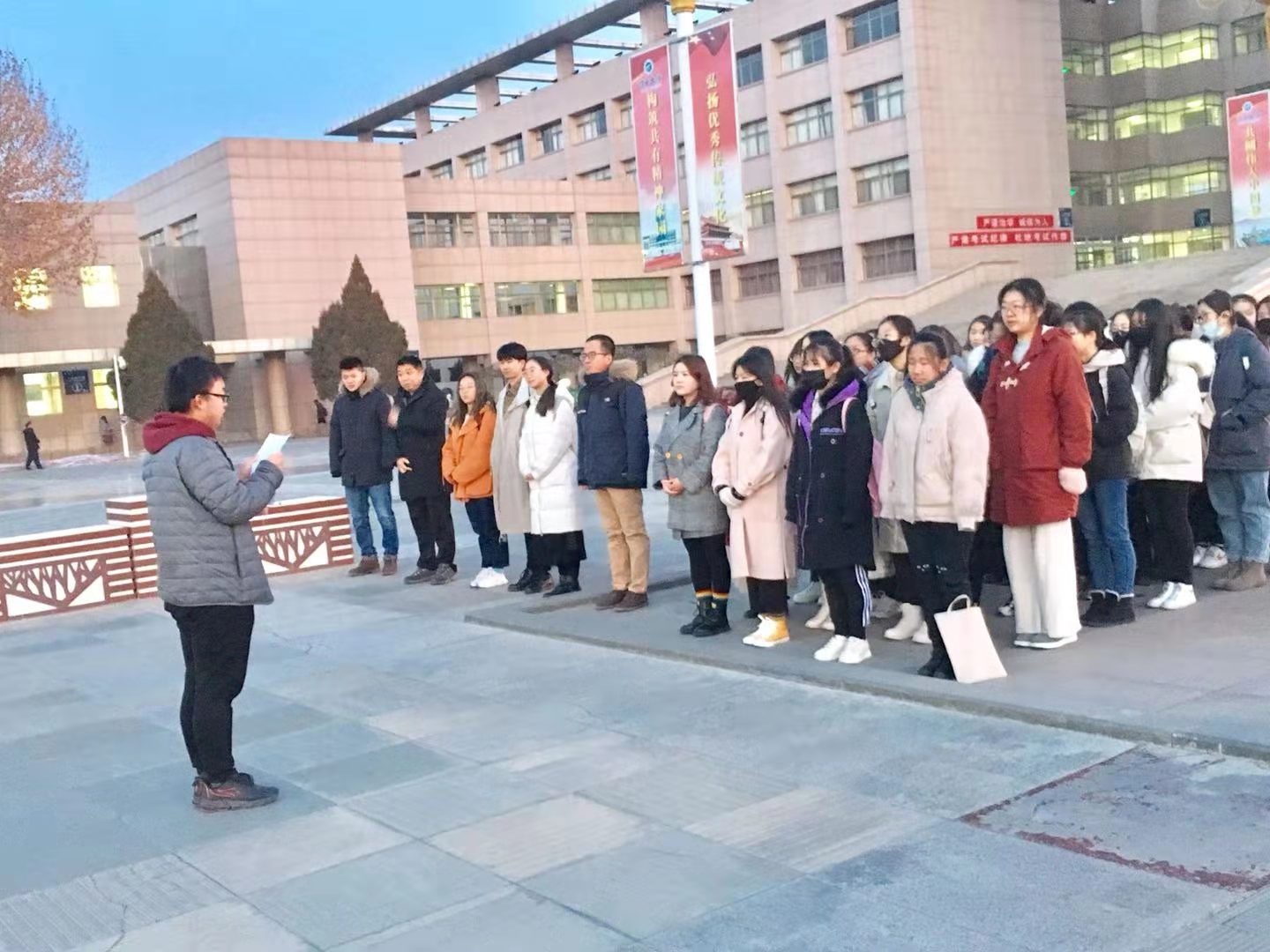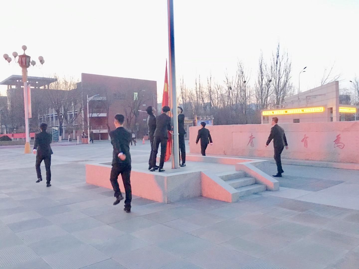 在A区主楼广场举行了庄严的升国旗仪式。学院党总支副书记赵永军老师、学办主任马生忠老师、学办金宁洋老师、学生会主席团成员及19级全体学生到场参加升旗仪式。升旗仪式由马主任主持。