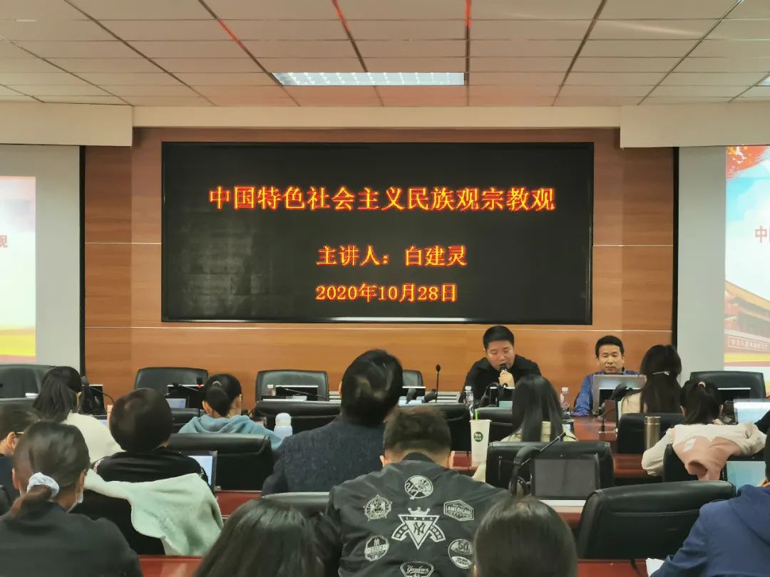 人文学院学院白建灵教授在知行楼8楼学术报告厅为师生做《中国特色社会主义民族观宗教观》讲座。学院、研究院全体教师、2020级新生参加报告会。报告会由党总支副书记赵永军主持。