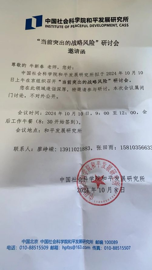 二、10月10日上午,应中国社会科学院和平发展研究所邀请,参加“当前突出的战略风险”研讨会并作重要发言。