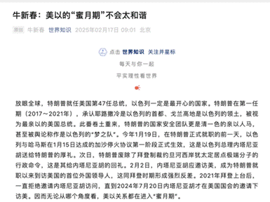 三、2月17日牛校长在《世界知识》发表文章,题为《美以的“蜜月期”不会太和谐》