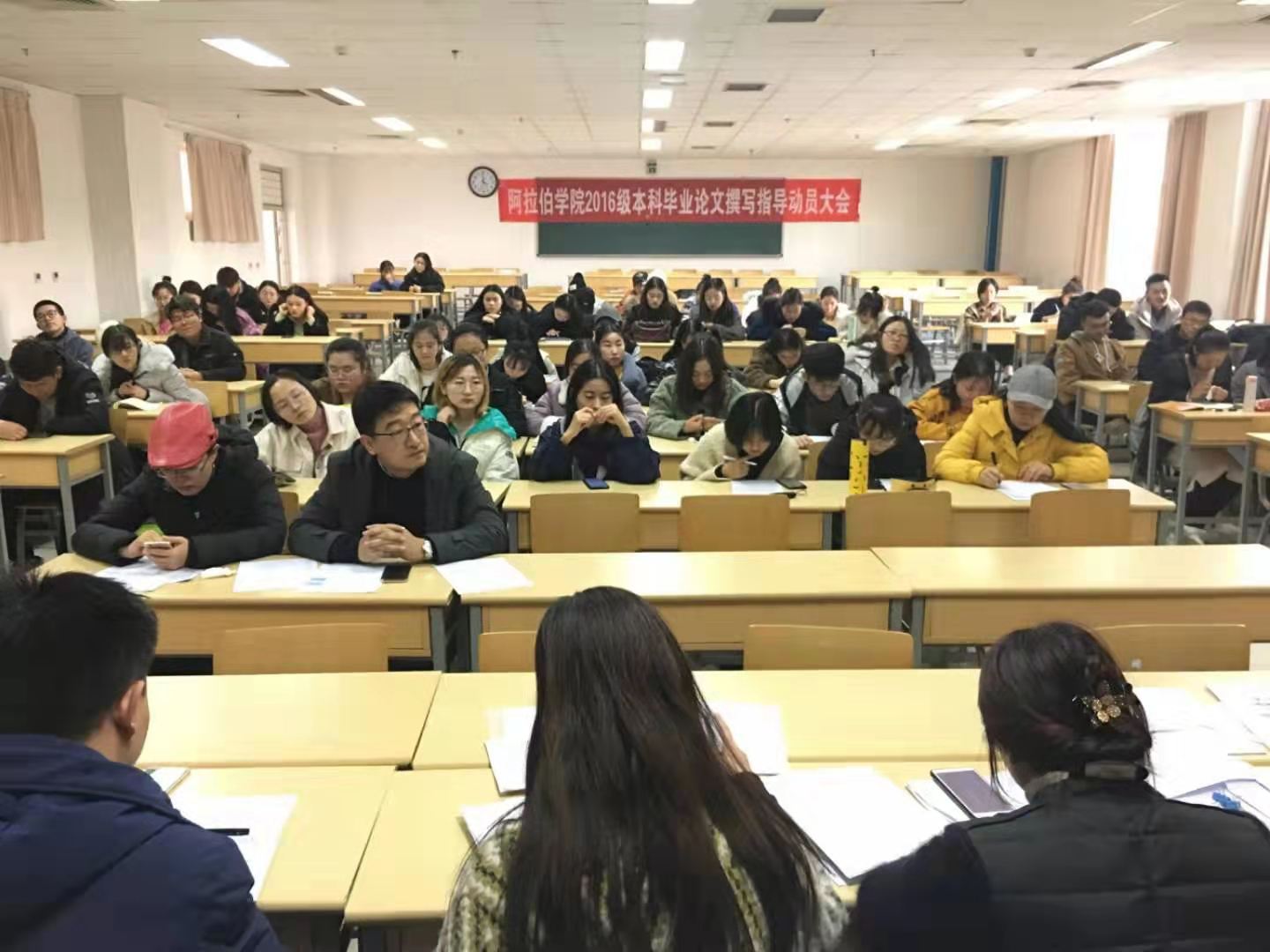 副院长白楠、中国阿拉伯国家研究院副院长冯璐璐、低年级教研室主任马成文与部分指导教师出席本次大会。本次指导会由白楠副院长主持,16级全体学生参加。