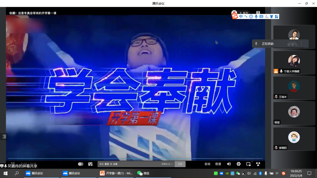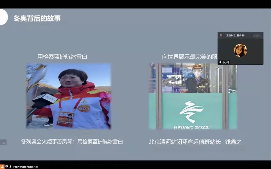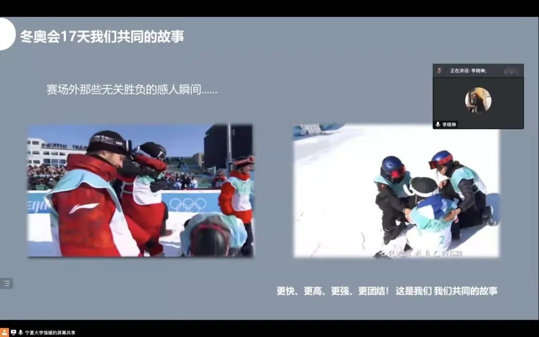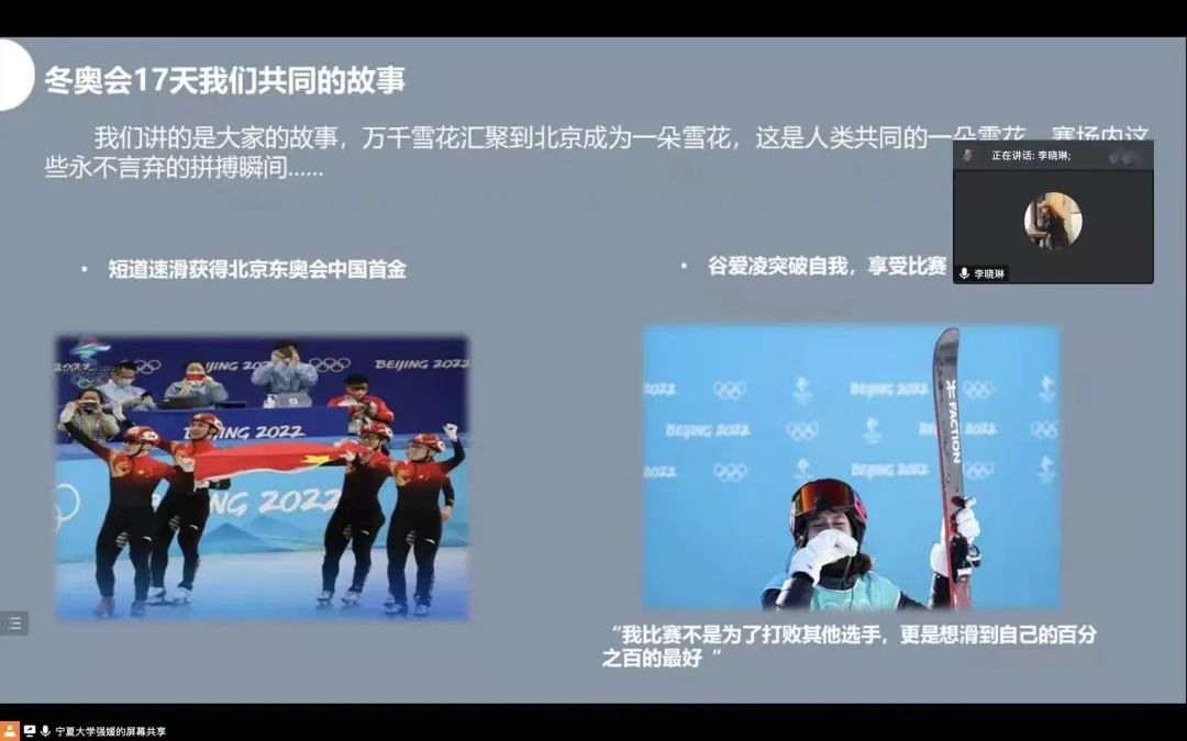 接着,研究生会学习部负责人李晓琳、文艺部负责人杨小菊分别以图文的方式为大家讲述了2022年冬奥会及冬奥会背后的故事。书写传奇的谷爱凌、“冰上飞人”高亭宇、冰雪女王王濛等等,在他们的身上,有着四年的隐忍与泪水,更有着咬牙夺回荣誉的拼搏与韧性,他们用实力告诉了世界,什么是对比赛的尊重,什么是奥运精神。