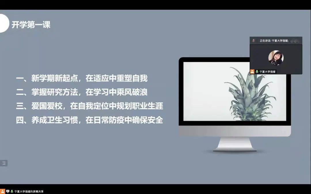 首先,研究生会执行主席强媛从疫情防控、学业规划、校园文化活动开展、安全稳定四个方面为大家讲述了“开学第一课”。她强调,新的学期,同学们要调整好自己的状态,严守校规校纪,合理地安排自己的生活,科学地去规划自己的学习。