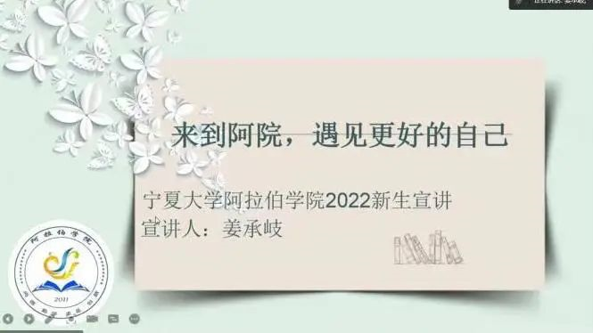 姜承岐学长,张璐薇学姐分享了阿语的有效学习方法,推荐了阿语视频,电影及书籍,除专业的学习外,也介绍了吃瓜视频 丰富多彩的校园生活,展示了宁大的醉人美景、激情竞赛及热心服务。